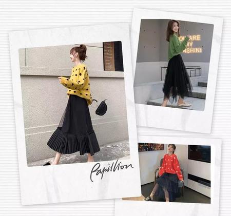 黑色纱裙搭配黄色桃心毛衣,甜美俏皮,飘逸中透着浓浓的可爱。