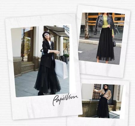 黑色纱裙也可以搭配不同颜色的上衣叠穿,层次感明显又时髦。