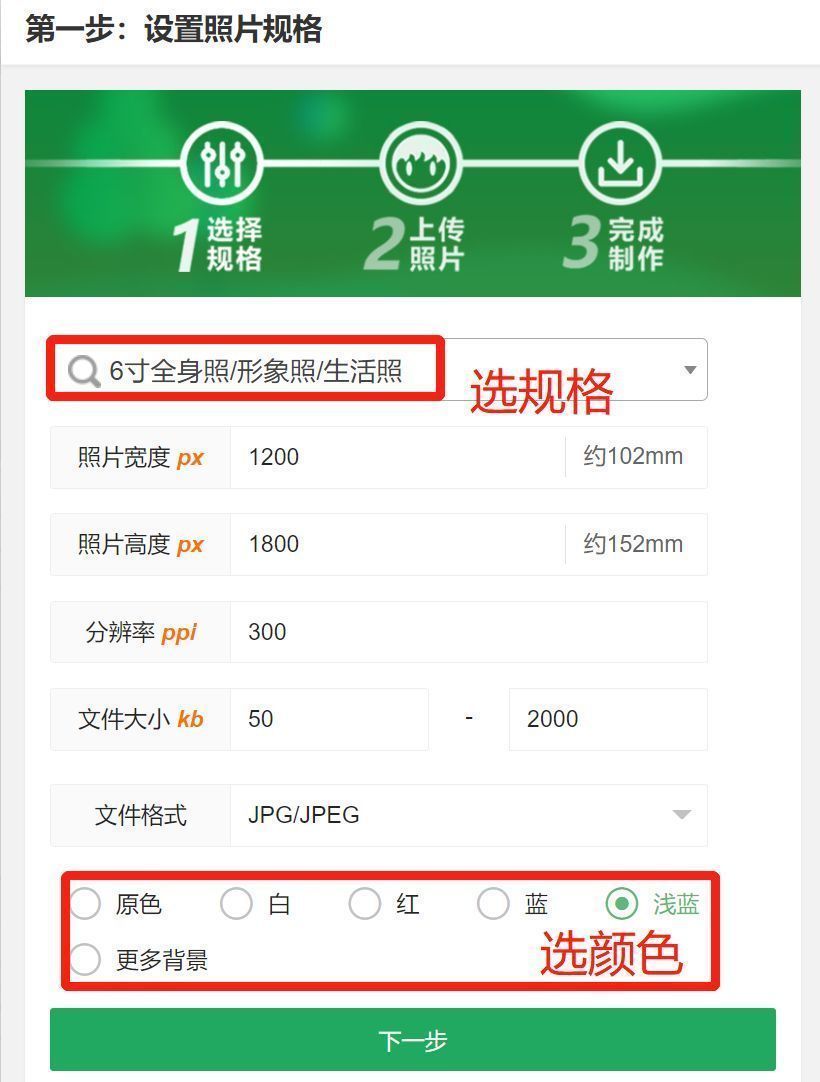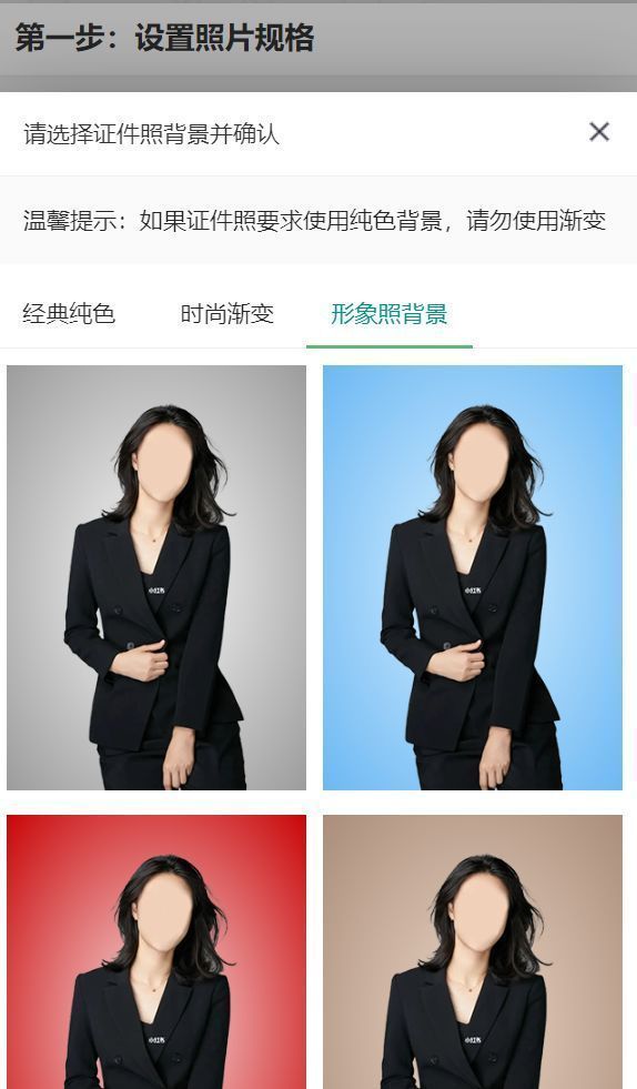 2、进入证件照处理功能,第一步是选择照片尺寸规格,以及照片背景色,常见的形象照尺寸有五寸、六寸和七寸照片。常用的背景色一般是渐变色。