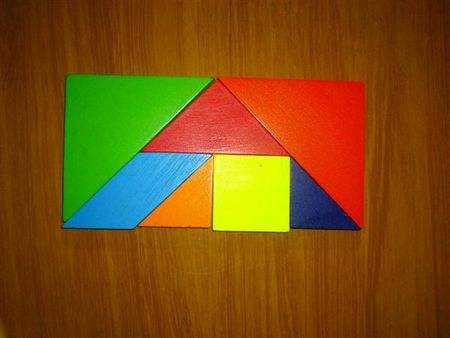 在第一步正方形的右边上方放一个小三角形,让它的两条直角边分别朝上和朝左,接着用那个平行四边形长边挨着这个小三角形的斜边,一条短边与小三角形朝上的那条直角边连成一线。再用中三角形的直角边靠平行四边形的另一条长边,注意这个中三角形的斜边朝右并成为长方形的右宽。