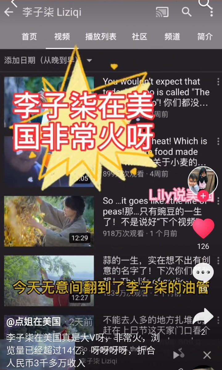 李子柒在美国是大V,非常火,浏览量已经超过14亿,折合人民币3千多万收入,不包括卖货收入!可想而知李子柒在美国的火爆力量!