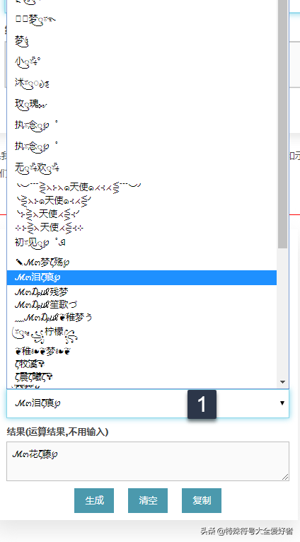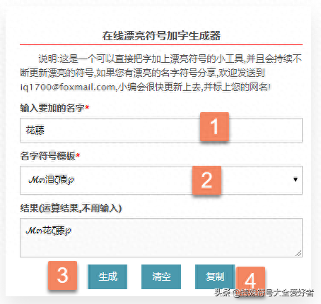 1-2:从操作界面我们可以看到,我们以"花藤"网名为例,想要生成:ζั͡花ั͡ζั͡藤ั͡ζั͡✾,只要按上面的输入就可以了,非常简单.同时第2步那里有很多符号供我们选择,我们也可以选择更多类型的符号,效果如下