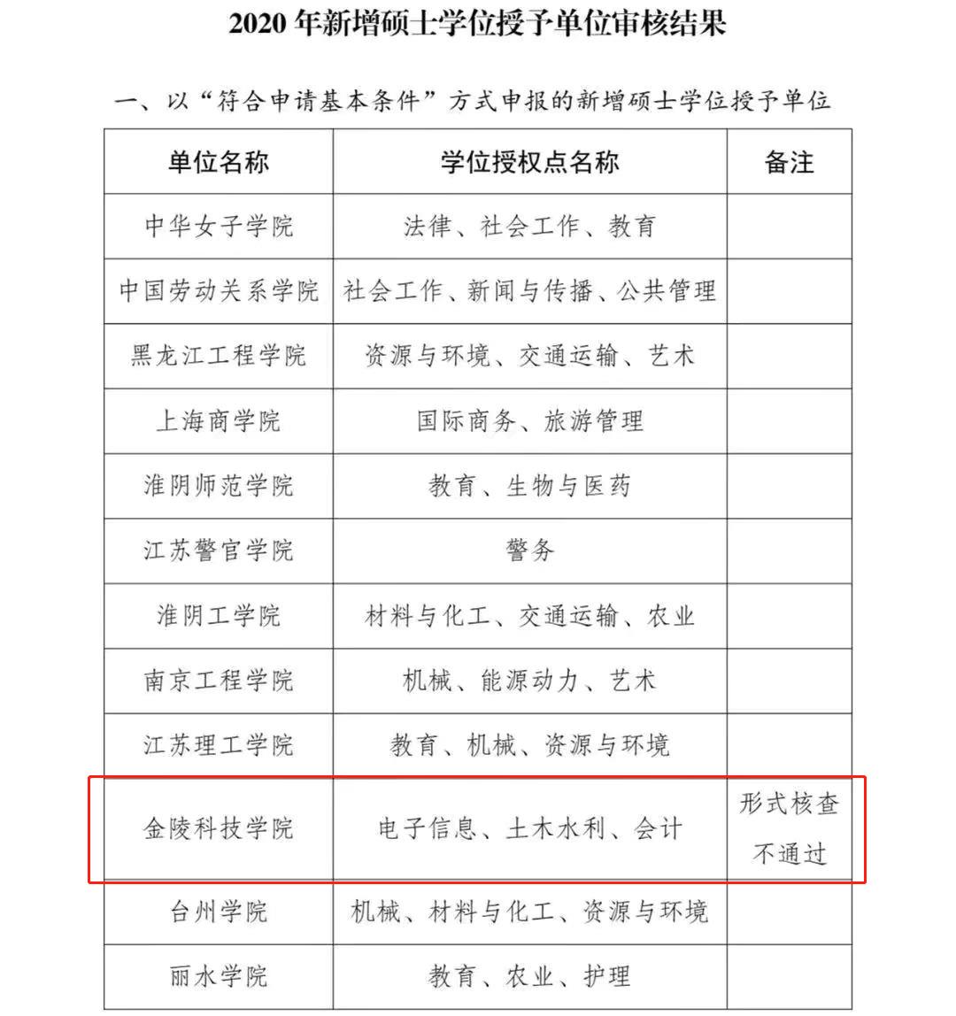 提及金陵科技学院申硕工作,可以说并不顺利。2025年,教育部公布了新增硕士学位授予单位审核结果,江苏有6所院校上榜,分别是淮阴师范学院、淮阴工学院、江苏警官学院、南京工程学院、江苏理工学院和金陵科技学院。不过与其它5所院校不同的是,金陵科技学院备注栏显示:形势核查不通过,这意味着金陵科技学院的申硕工作并没有确切的结果,还处于待定状态。