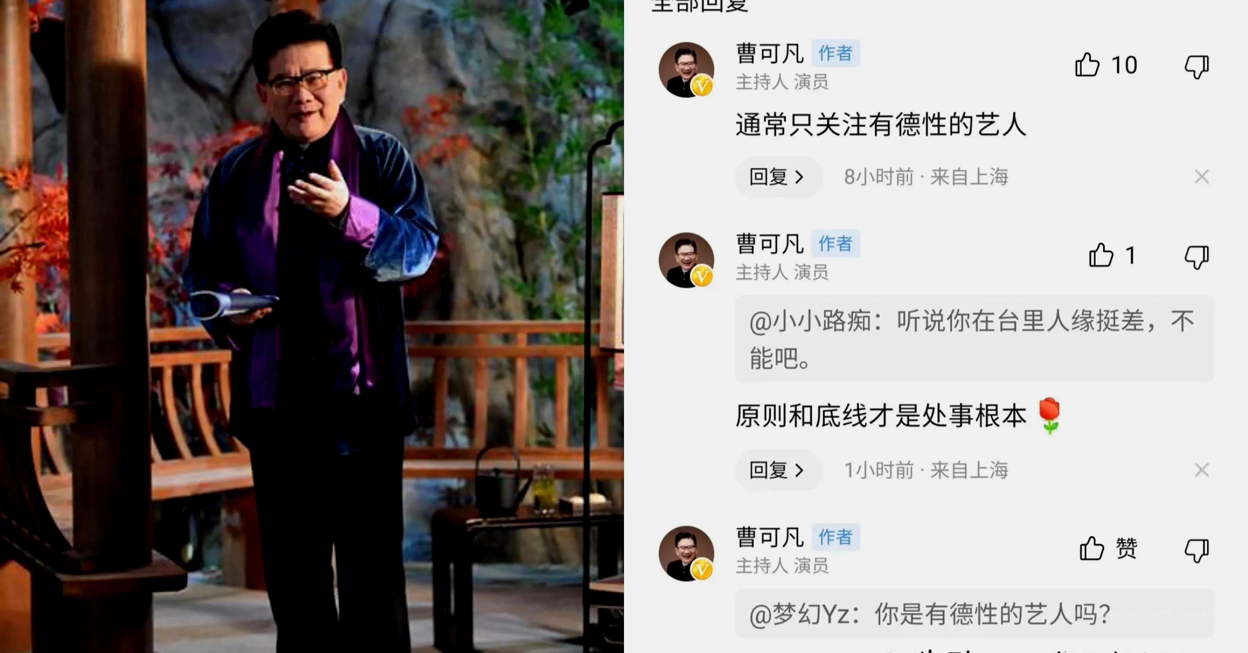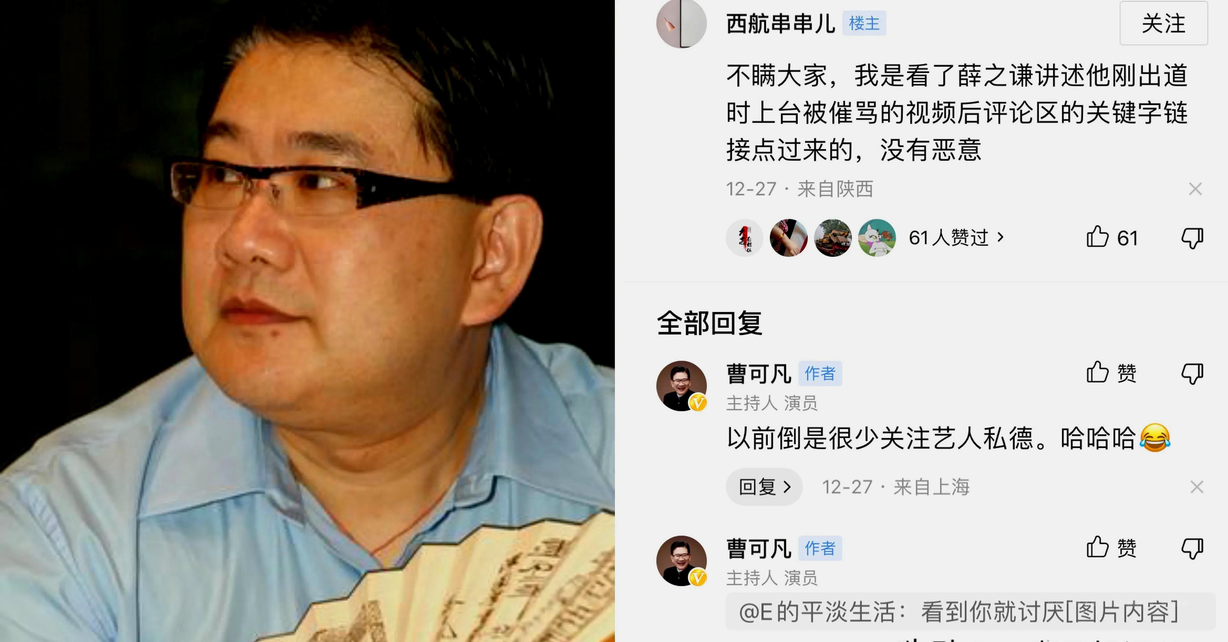 另一名网友直截了当地询问曹可凡对待薛之谦的事件有何看法,曹可凡回应道:“通常只关注有德性的艺人。”这句话引发了更多网友的追问,有人甚至请曹可凡评价自己是否为有德性的艺人。曹可凡这时收敛了锋芒,回应说:“我是媒体人。”