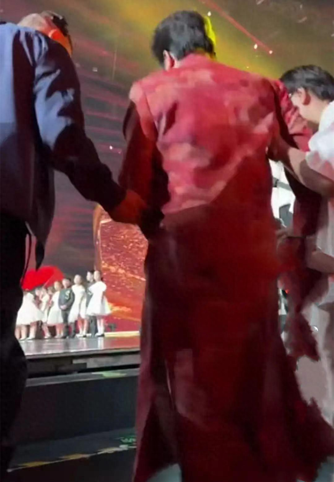 而在登上舞台时,李玉刚还需要两名工作人员一左一右地架着他。