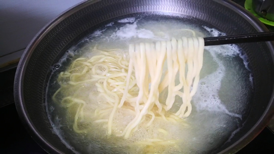 6、锅中加入适量的水,水开以后,下面条,用筷子阁楼阁楼,锅中的水在次开了以后,再把面条煮2分钟,把它捞出来过一下凉白开水。最后把过好水的面条里浇上烧好的豆角土豆卤。一道简单好吃又营养的家常面条就做好啦!