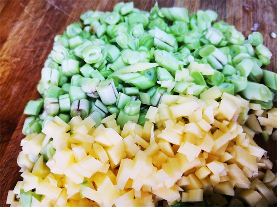 2、再准备一点豆角和土豆,把它们分别切成丁,放入碗中备用。