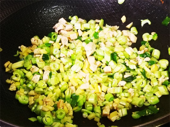 4、将锅烧热,放入一点食用油,油开后,放入猪肉丁,炒至变色以后,再放点葱花,姜末炒出香味,然后倒入豆角和土豆丁,翻炒均匀,最后调味,放点盐,五香粉,生抽酱油,炒匀,再放入适量的清水(也可以放开水),大火烧开后,再淋入一个鸡蛋液,鸡蛋液熟透后,放点味精,香油,盛出来。