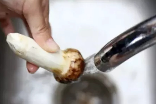 然后将削好的松茸,迅速地拿到水龙头下冲洗干净。