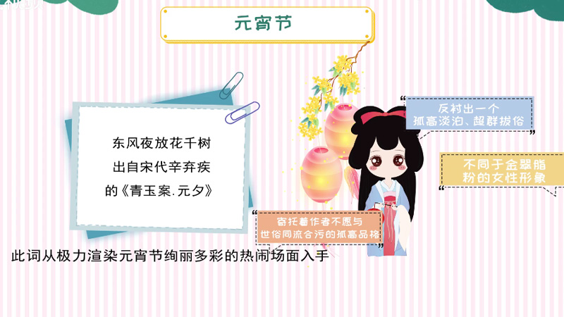 元宵节,东风夜放花千树指的就是元宵夜晚花灯满街的样子,出自宋代辛弃疾的《青玉案.元夕》此词从极力渲染元宵节绚丽多彩的热闹场面入手,反衬出一个孤高淡泊、超群拔俗、不同于金翠脂粉的女性形象,寄托着作者政治失意后,不愿与世俗同流合污的孤高品格。