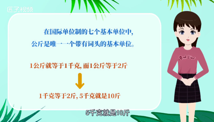 实际上,公斤就是千克,两者的说法不同,但意思相同。在国际单位制的七个基本单位中,公斤是唯一一个带有词头的基本单位。1公斤就等于1千克,而1公斤等于2斤,也就是1千克等于2斤,5千克就是10斤。