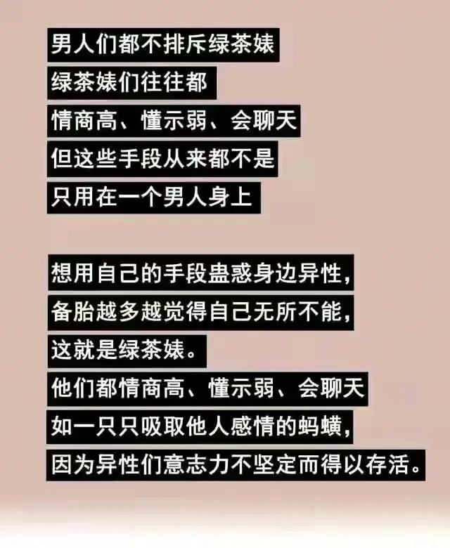 4、走心呀,绿茶app里的妹子情商挺高的,懂得怎么说话,会察言观色,还知道该怎么让你开心或者更开心,我自己跟她视频聊天最大的感受就是情商挺高,人挺暖心的,这样的妹子应该算很走心的绿茶情人了;绿茶婊,是一些女性网友对另一些假装清纯实则内心城府颇深粘人周旋于各种男人的单身女性的称呼特指那些装纯的婊子,总是长发飘飘清汤挂面貌似素面朝天但暗地里化了妆,特质是装出人畜无害心碎了无痕岁月静好的多病;1绿茶妹是麒麟网的屌丝励志卡牌轻手游及网络电影的“影游互动”同名系列作品该作品分为手机游戏及系列网络电影两部分,手游将于12月17日正式上线,绿茶妹网络电影第一部已上线,第二部将在2013年末贺岁档上线;绿茶妹同绿茶婊绿茶妹是由不明身份的网友发明,是对2005年在坊间就出现的外围女一词又取的一个侮辱性称呼,三亚海天盛宴事件让外围女第一次走进公众视线但三亚的外围女模随后被警方爆光是男儿身,这不禁让人唏嘘各种;绿茶妹是由不明身份的网友发明,是对2005年在坊间就出现的外围女一词又取的一个侮辱性称呼,三亚海天盛宴事件让外围女第一次走进公众视线但三亚的外围女模随后被警方爆光是男儿身,这不禁让人唏嘘各种发型都可能出现;每天,她不顾对方的感受,经常拉黑删帖,不然就分手,不会施展女人味,只会施压谈恋爱的时候,也要讲究方法和方法一个嫉妒的绿茶只和她有关并不是说脾气好情商高的女生都是绿茶有人说“绿茶”和“绿茶妹”是;1一般来说绿茶妹的颜值在一般以上,属于稍有姿色,但是这不是重点,而是心机和套路2一般阅历丰厚会装作不谙世事,装出天真无邪的模样比如感情史她会隐去说自己是第一次恋爱,没有过性经历3她会对你做出。