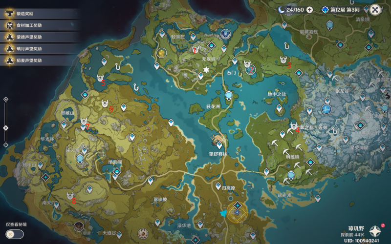 :由于璃月地图较大,这边分两张图来给大家看,碧水原的数量是最多的。轻策庄的那个是在山底的洞穴里,不在山顶,别弄错了。