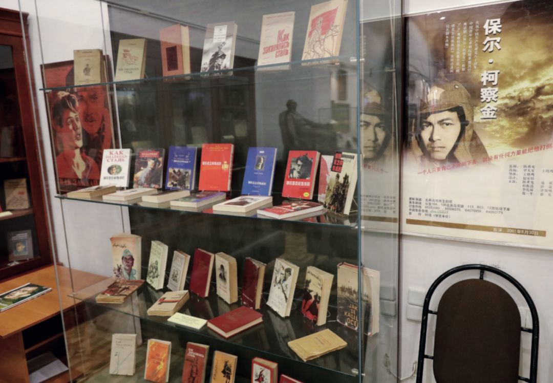 展厅的玻璃书柜里,摆放着被翻译成各种语言的《钢铁是怎样炼成的》,其中中文译本最多,占据了整整一层,有青少年版,还有新课标版。书柜旁边的墙壁上,张贴着中国青年艺术剧院的话剧《保尔·柯察金》的海报。