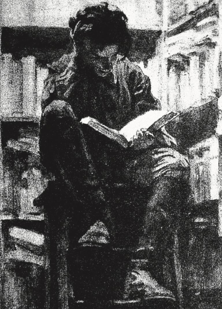 《钢铁是怎样炼成的》插图,保尔·柯察金在图书馆里读书。 图/FOTOE