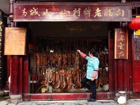 腊肉是四川人非常喜欢的一种腌制食物,过年过节、红白喜事,桌子上都少不了它的踪影,青城山老腊肉所采用的均是绿色健康的五花肉,结合历史悠久的工艺制作而成,其口感醇香,肉质鲜美,色泽金黄,味道香浓,而且储存时间长,因此有很多外地的游来成都游玩时都喜欢带一些回去。