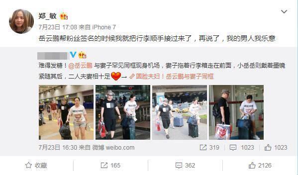 当天下午,郑敏发微博怒怼网友:“岳云鹏帮粉丝签名的时候我就把行李顺手接过来了,再说了,我的男人我乐意!”