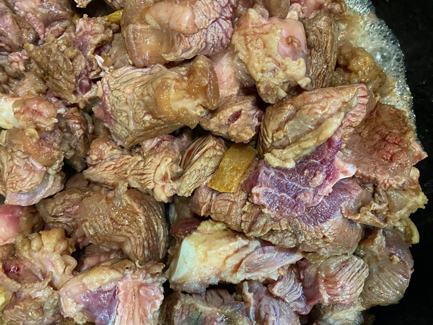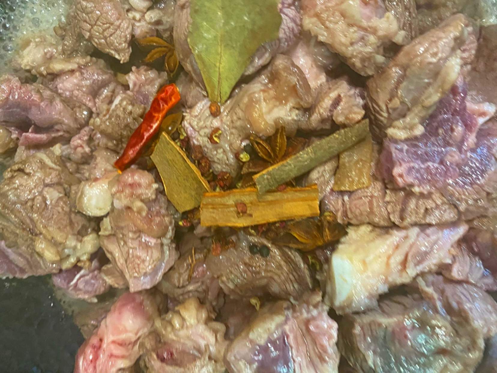 食材:牛肉、黄酒、葱结、姜片、八角、桂皮、香叶、花椒、干辣椒、五花肥油