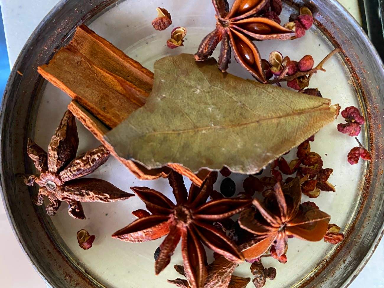 3、准备一下炖肉的大料,八角4个,花椒一小把,桂皮2块,香叶2片,干辣椒3个,如果想加速炖牛肉的速度,可以再加1勺红茶,3片干山楂,能软化牛肉,让牛肉更软烂,熟的更快。