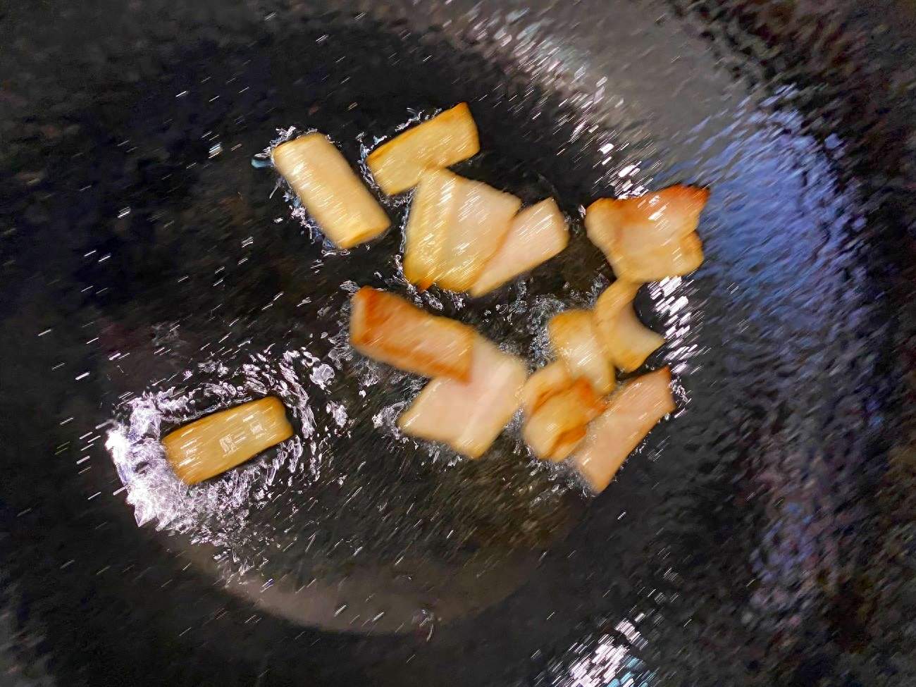 4、起锅烧油,先切几块肥五花肉,干煸一下,煸出内部的油脂,肉片煸干以后,捞出来扔掉,只要底下的五花肥油,用这个炒牛肉,味道非常香,试试您就知道了。