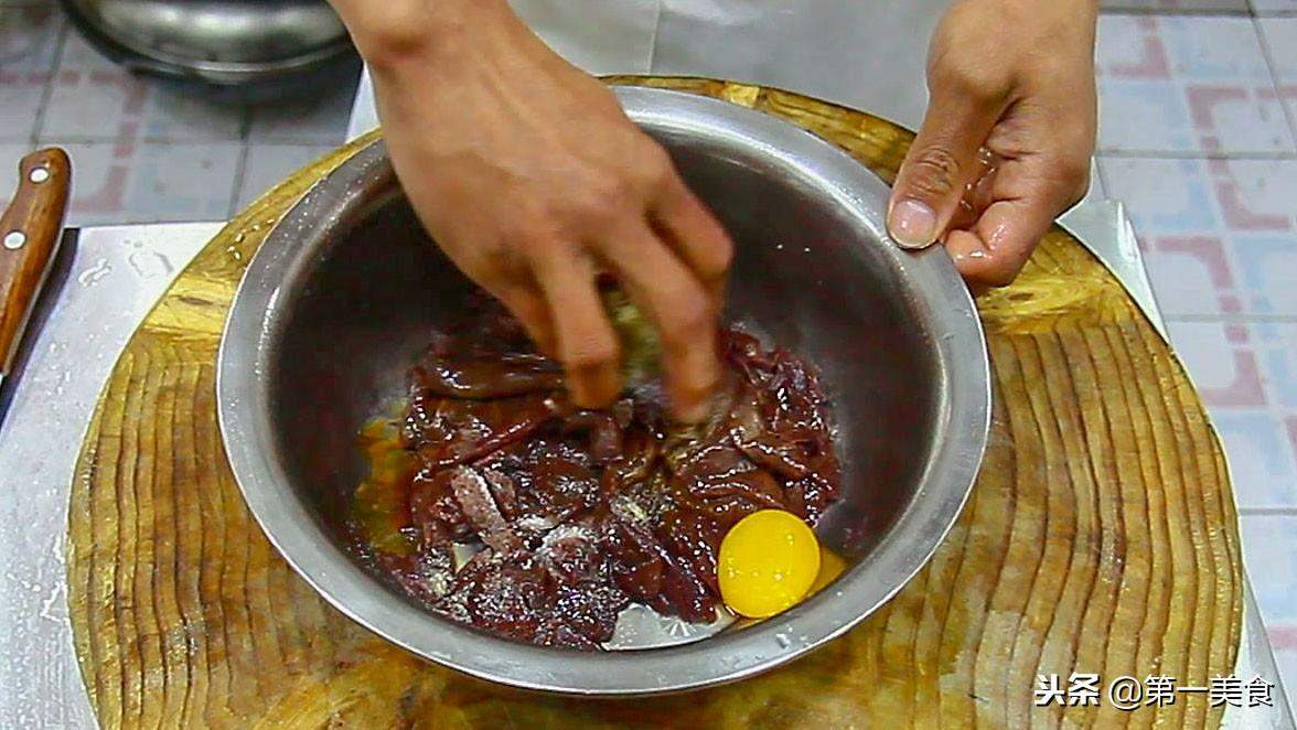 接着放入一点植物油,再次抓匀,放点植物油防止猪肝下锅粘连。