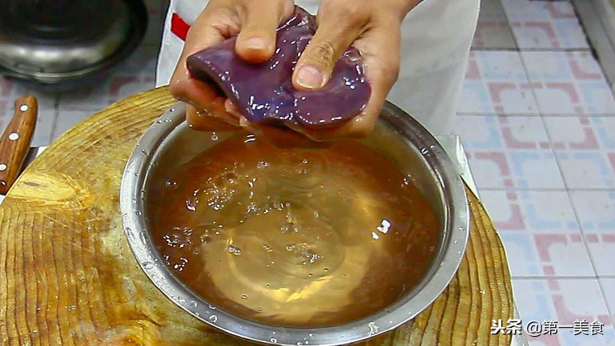 把猪肝筋膜撕去,放入盆中,最好用流动的清水反复清洗挤压,洗出猪肝里面的血水,一直洗到不再出血水为好。