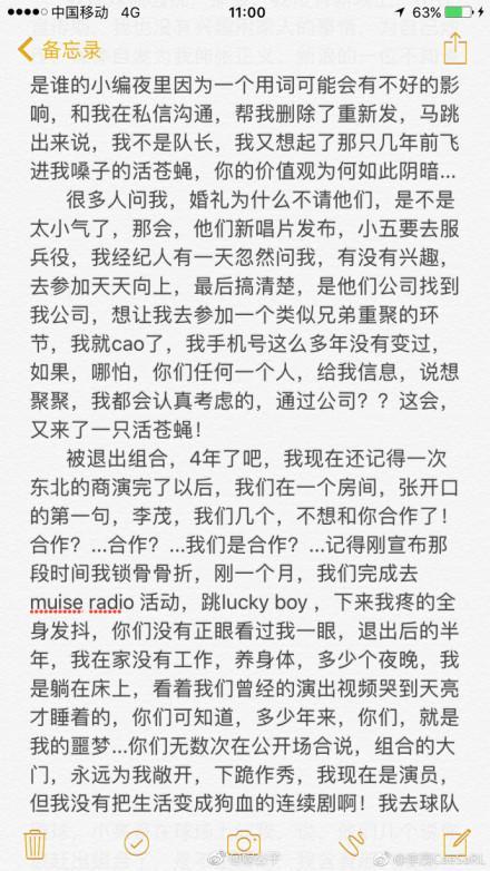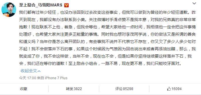 虽然直到现在为止,当事人刘洲成还没出面发声,但是作为前成员的李茂倒是发声了,不但澄清自己退团是因为被退团,还说明了自己多年替马雪阳背锅,但是网友发现李茂的发声好像不是为了澄清这些真相,更多是为了说明马雪阳是渣男。