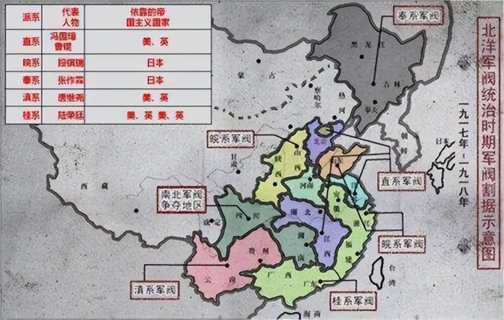 直系的冯国璋在英美的支持下,控制长江中下游的苏、赣、鄂及直隶等省;皖系的段祺瑞在日本支持下,控制皖、浙、闽、鲁、陕等省;奉系的张作霖以日本为靠山,占据东北三省。