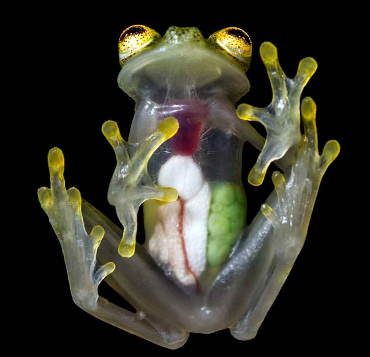 如果在青蛙界里面搞一个选美大赛,玻璃蛙的美貌绝对是数一数二的,长得人畜无害,无毒且颜值超高,体型苗条纤细,体长只有2-3厘米,后腿长而有力,大大的眼睛有着大理石一样的纹理,和玉石一样的色泽,就像带着一对美瞳,隐藏自己的玻璃蛙,整个身体就像用透明玉石雕琢而成的艺术品,透过腹部透明的皮肤,可以看到心脏正在强有力地跳动着,而整个肠道和内脏都可以看的清清楚楚,这种“直击内心”的视觉感受,让人不得不感叹大自然的神奇。