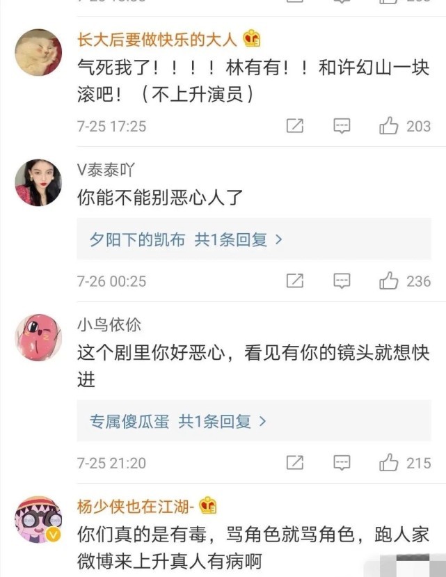 从《二十不惑》到《三十而已》,只有林有有演技好到遭全网怒骂,演员本人也遭受网友攻击。网友们建议,以后热剧都要给剧中人物开一个微博账号,省得一些拎不清的人去打扰演员本人。