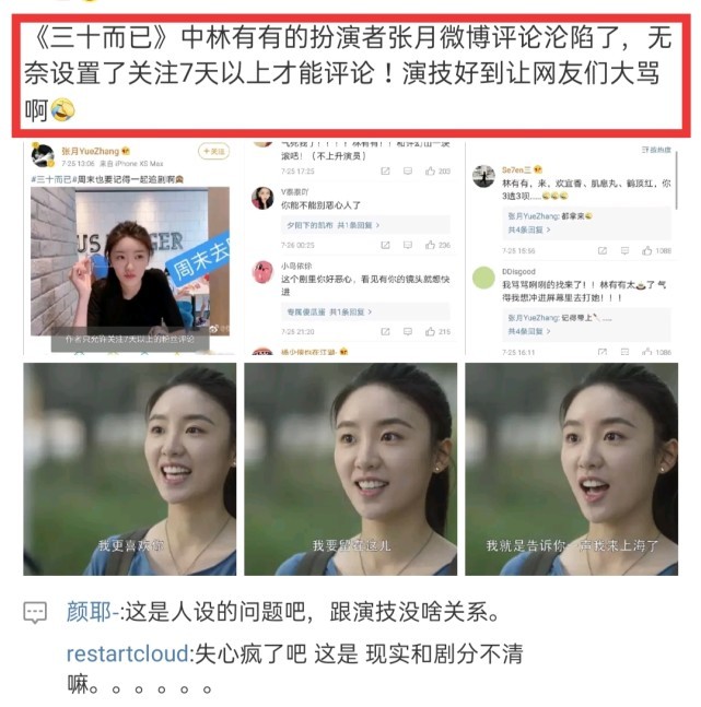 相信大家都很好奇,《三十而已》林有有到底什么来头?绿茶到遭全网怒骂。不少网友看完剧后,都跑到林有有扮演者张月微博底下开骂,而且毫不客气。观众们追剧代入感太强了,从角色上升到演员本人,张月无奈设置了关注7天以上才可以评论。