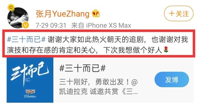 面对网友对角色的舆论攻击,张月发微博回应:谢谢大家如此热火朝天的追剧,也谢谢对我演技的存在感的肯定和关心,下次我想做个好人。
