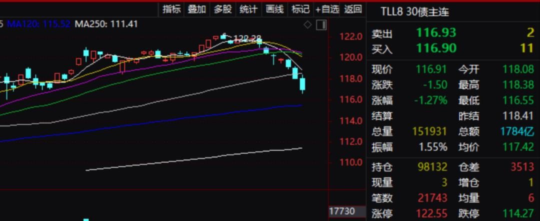 午后,国债期货跌幅持续扩大,30年期主力合约一度跌1.50%,创去年12月以来最大跌幅,10年期主力合约跌0.50%,5年期主力合约跌0.27%,2年期主力合约跌0.07%。
