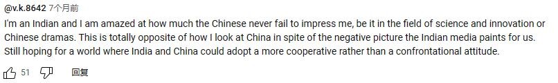 v.k.8642:我是印度人,非常震惊,中国人总是给我留下深刻的印象,无论是在科学和创新领域还是在中国电视剧领域。印度媒体天天为我们刻画负面形象,但这些和我对中国的看法完全相反,希望印度和中国能够采取更加合作而不是对抗的态度。