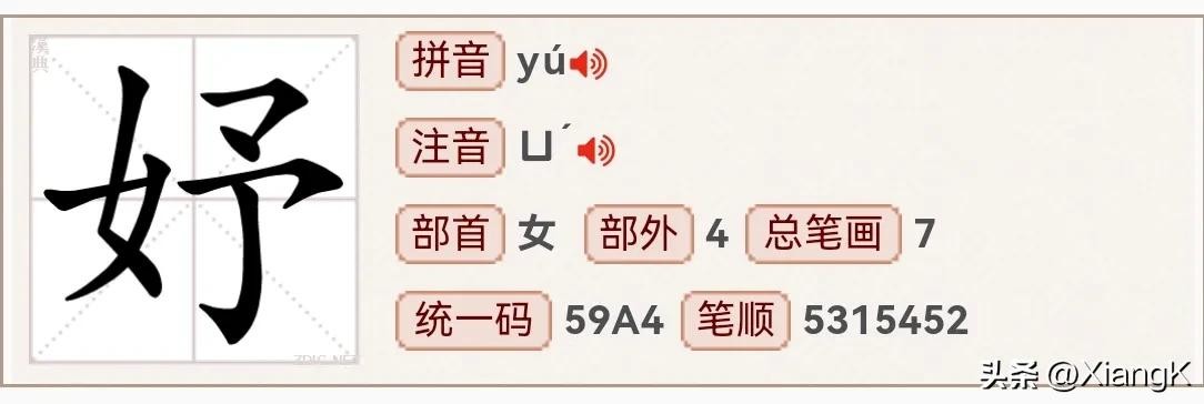 读音为“yú”,同音字“渝”,部首为“女”,总笔画7,左右结构。