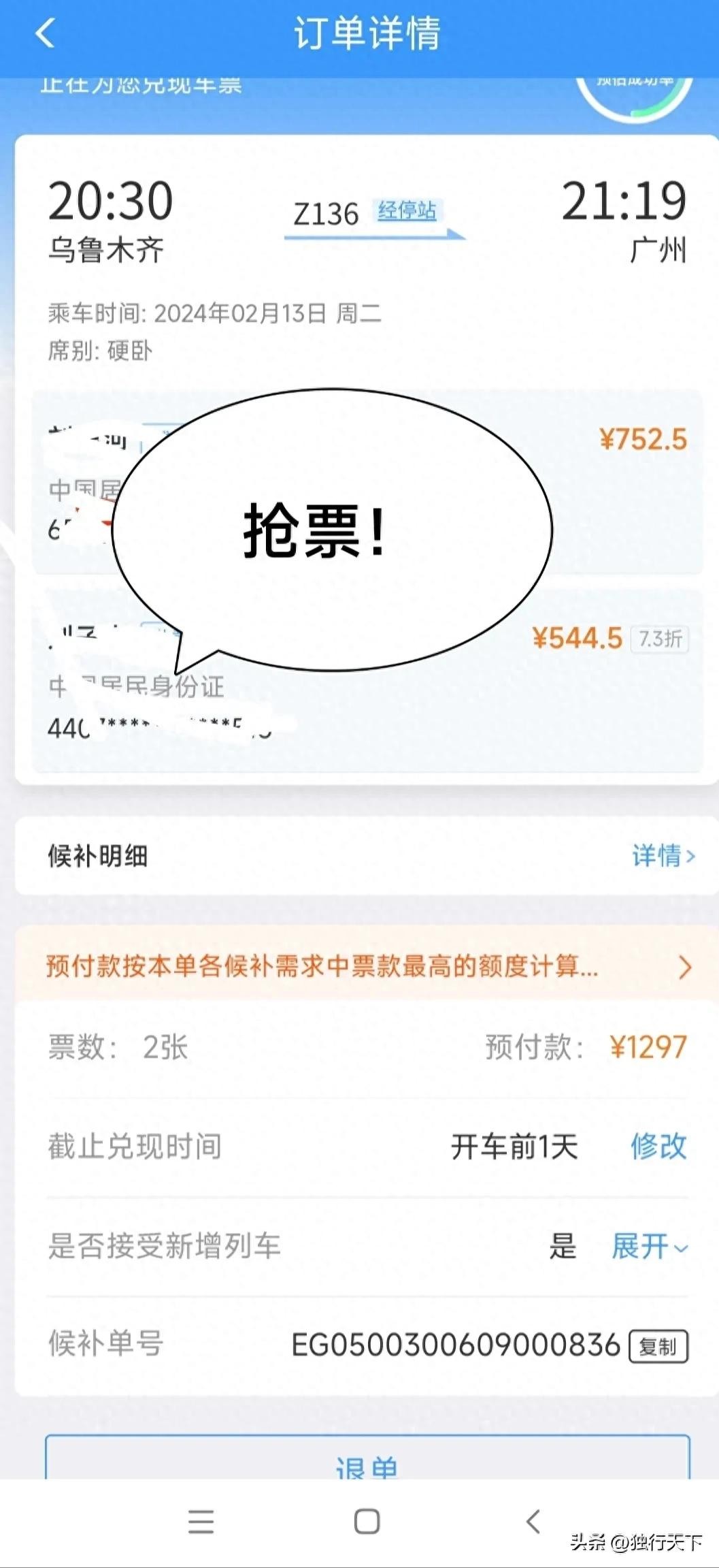 从新疆乌鲁木齐到广州的火车票一开售就立马在12306上抢了,选择了2月13.14.15三日候补,到现在还是候补中……也不知道能不能成功。