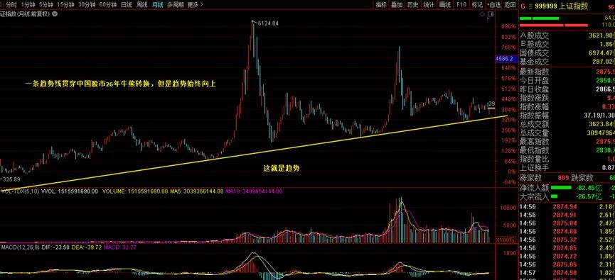 趋势意指事物的发展方向,落实在股市上意在表明某一段时间的市场走势状。如下图(1)上证指数月K线来描绘了中国股市26多年的走势状况,一条趋势线贯穿中国股市26年,但是趋势始终向上。我们知道事物总是波浪式前进、螺旋式上涨的。通过上证指数26多年的走势来看的确在验证这样的一个概念,而且是低点不断地抬高,虽然中间的走势过程中有大的冲高和大的回落,但是总体趋势是向上的。