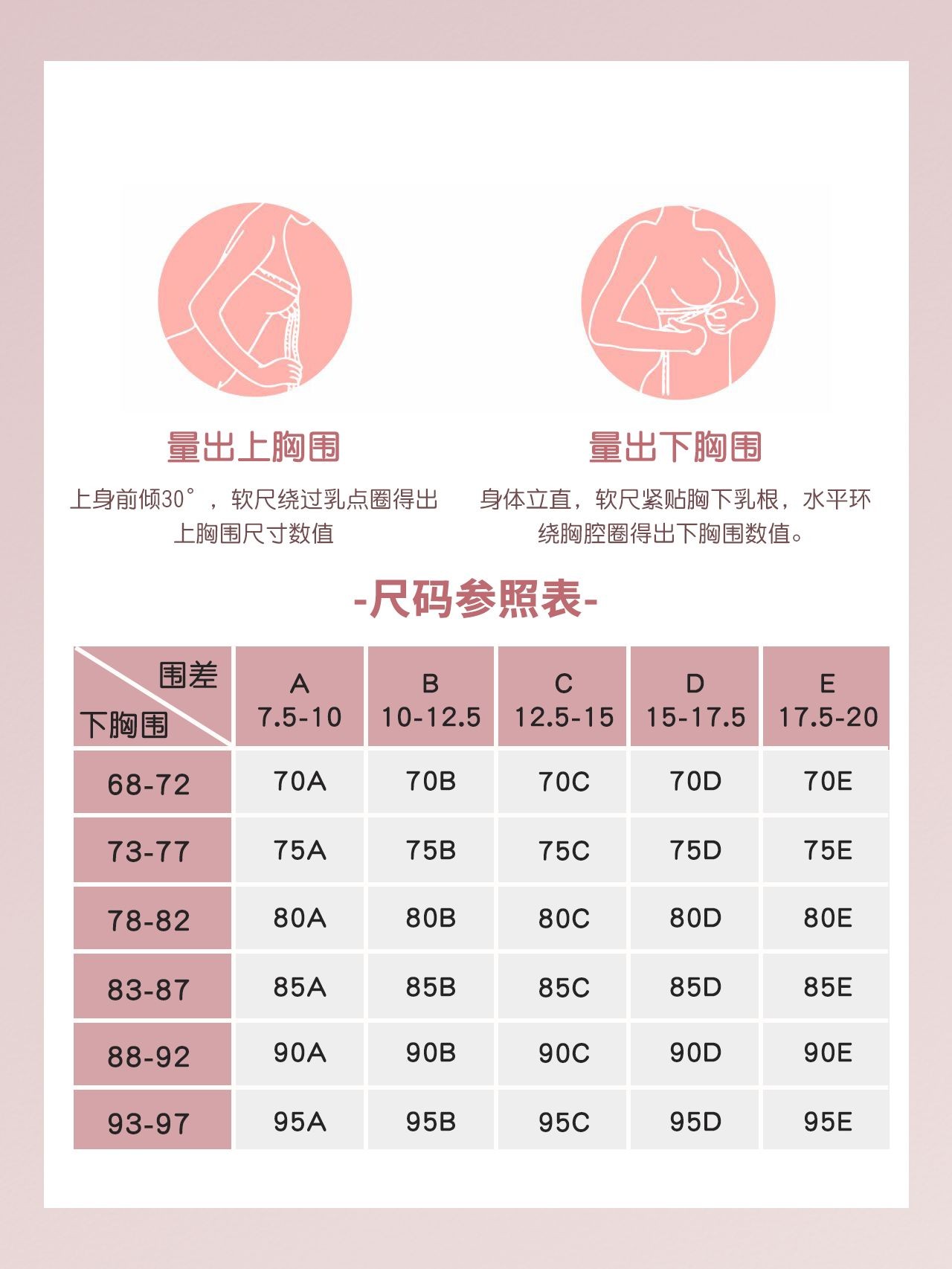 接下来,我们来看看罩杯是如何划分的。罩杯取决于(上胸围-下胸围)的范围数值,常见的A/B/C/D杯的划分就是围差。以38码为例,如果你的上胸围为91厘米,下胸围为83厘米,那么围差就是91-83=8厘米。这个围差值对应C罩杯(12.5-15厘米),所以你应该选择38C的内衣。