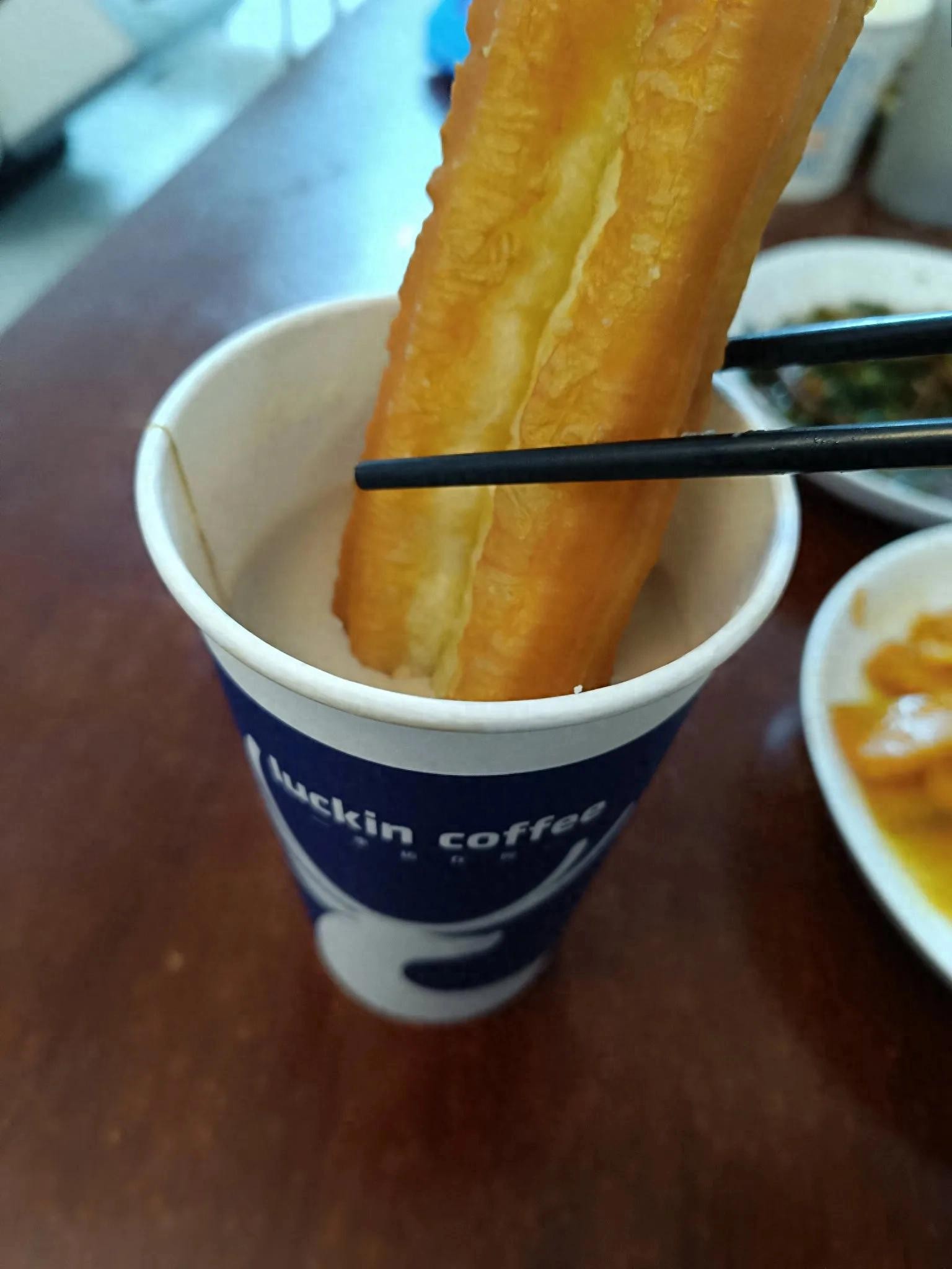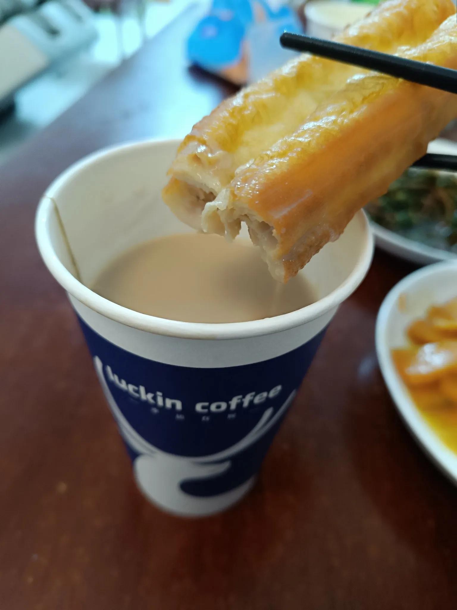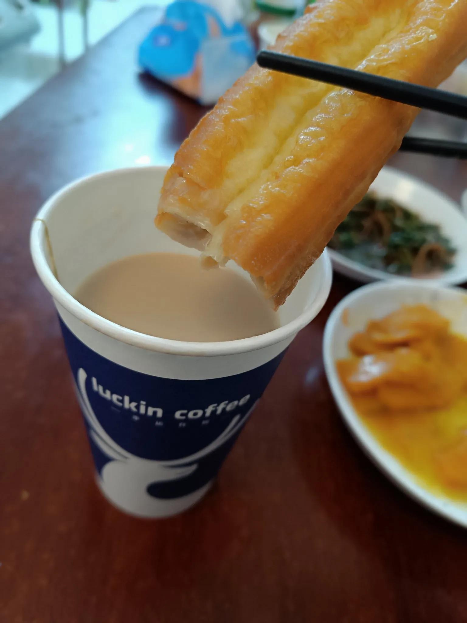 我拿起咖啡,走到饭桌前,准备享受这份突如其来的美味。就在这时,我注意到桌上还有半根油条,那是今天早上匆忙出门时留下的。油条已经冷却,还带一点早晨的酥脆。