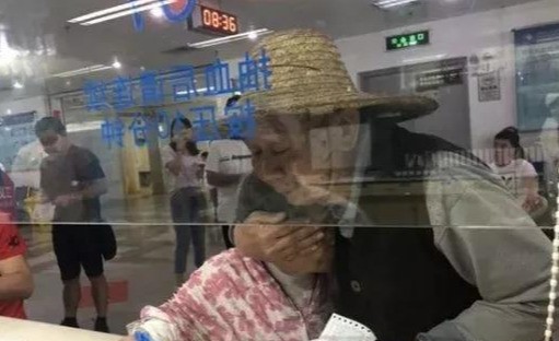 深圳草帽爷爷带着老伴上医院抽血,奶奶害怕爷爷顺手就把她搂到了怀里。