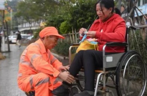 丈夫为了能随时照顾妻子,辞去原来的工作,主动应聘环卫工,妻子不放心丈夫,每日马路旁边织毛衣边陪伴丈夫。