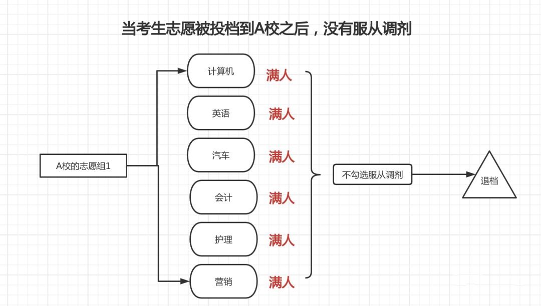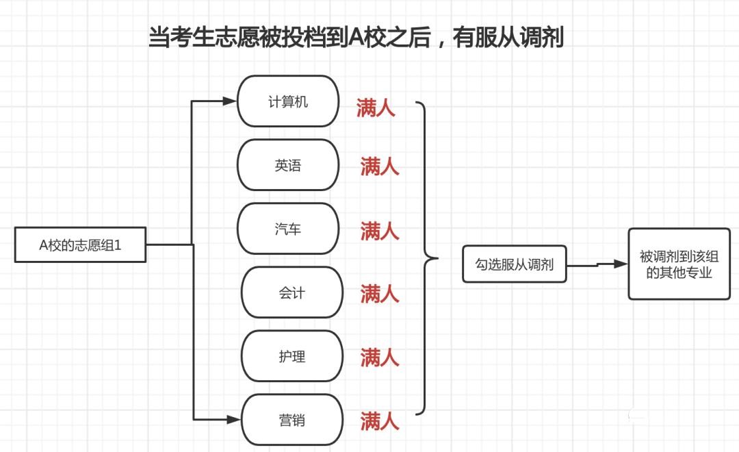 *如果你所填报的第一个院校专业组志愿人满了,学生志愿档案投不进去学校,这种情况无论考生服不服从调剂,都会直接检索第二志愿。