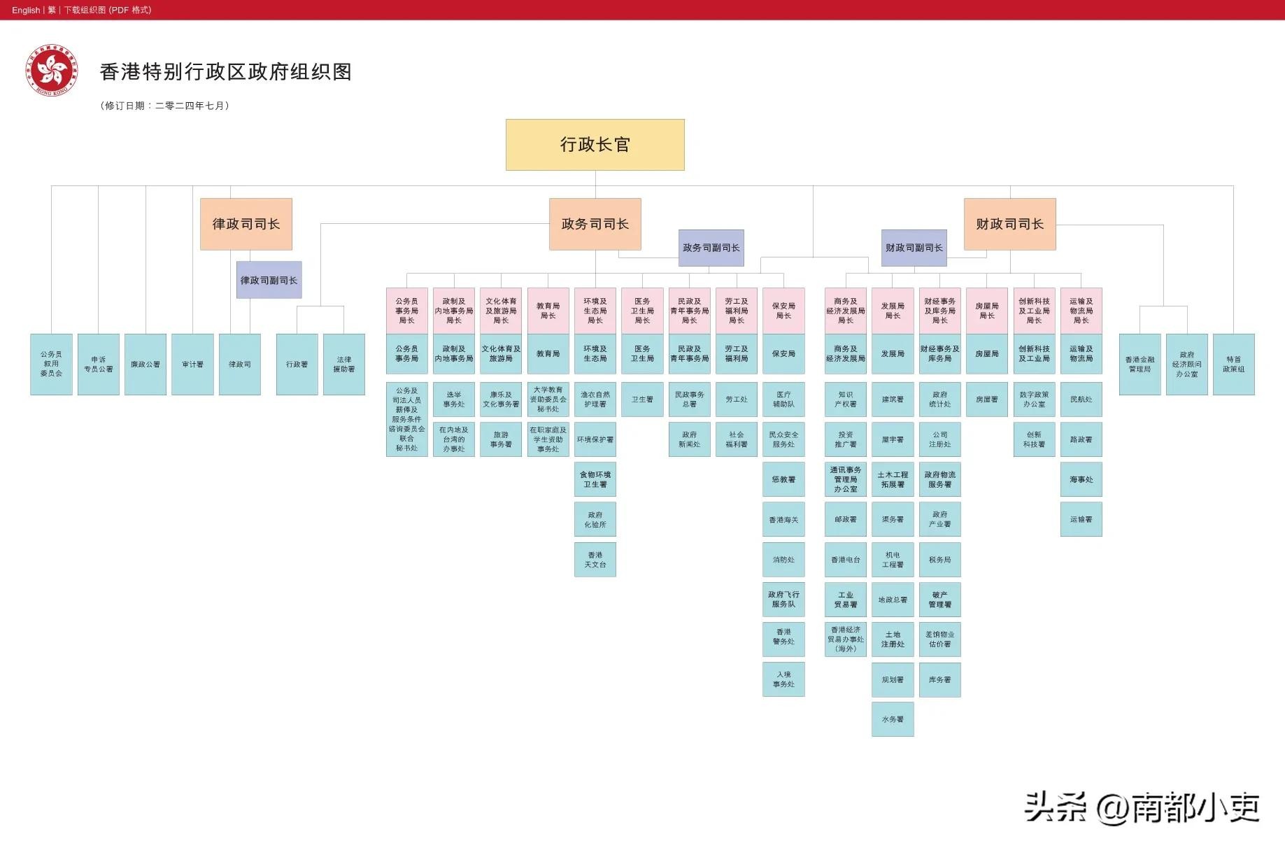 第三层级为五十六个部门,也是政策执行部门,这些部门一般以“处”、“署”、“所”、“队”为名,如警务处、环境保护署、政府化验所、政府飞行服务队等,相当于“直辖市的市直机关”,部门一把手相当于“市局局长”。