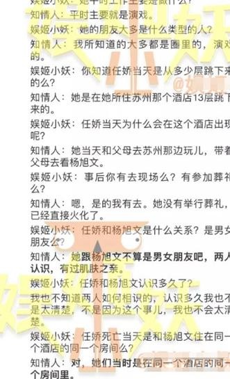 在任娇离世前,她曾与杨旭文一同进入酒店房间。这一行为引发了外界的广泛猜测,有人认为两人是情侣关系,也有人认为两人只是普通朋友。无论两人关系如何,这一行为都成为了任娇离世事件中的一个重要疑点。