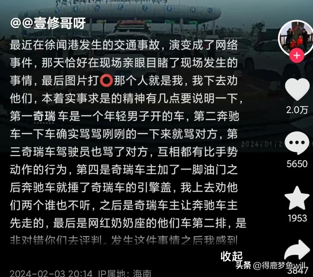 但是当一段奔驰车内的行车录像片段被公布后,有网友根据录像分析了显示奔驰车好像不是“强行加塞”而是“正常交替通行”,大家又开始众说纷纭,甚至奇瑞车被扒出驾驶员并非是徐老太,而是一名男子。在徐老太女儿发声强调,自己自始至终都未说过其母亲是驾驶员时,官方媒体黄金三十分公布了一段语音记录,徐老太一家被啪啪打脸。