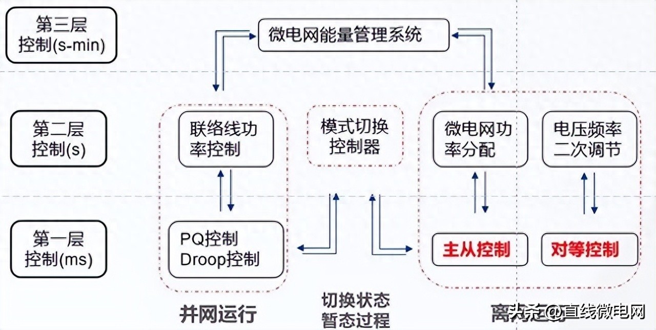 微电网分为三层控制,在离网模式下微电网常用的控制模式是主从控制和对等控制。