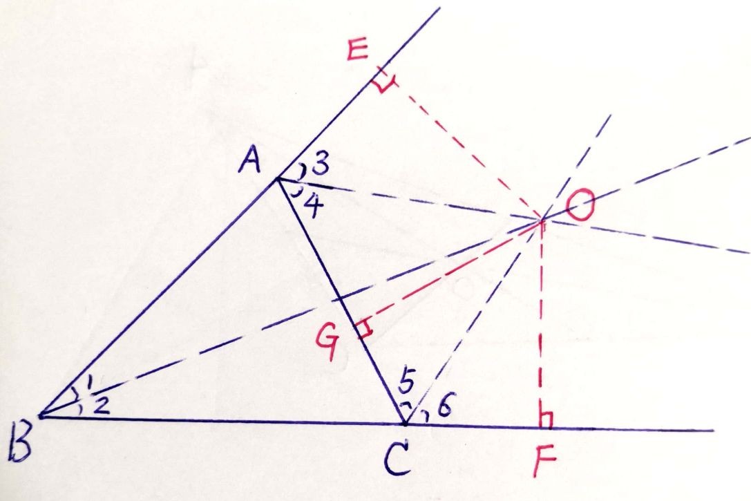 [性质1] 旁心到三角形三边的距离相等,即OE=OF=OG。