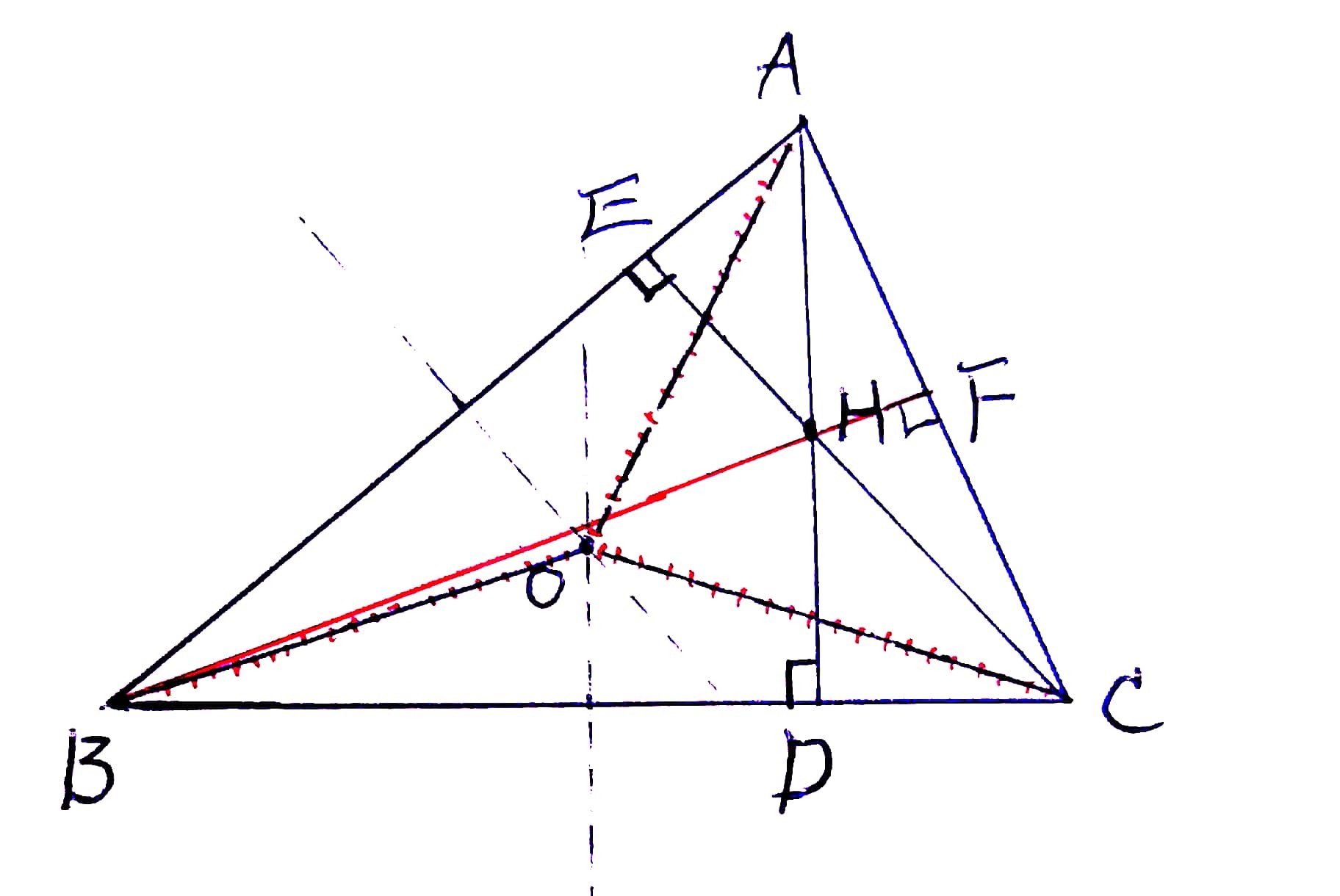 [性质9] 锐角三角形的垂心到三顶点的距离之和等于其内切圆与外接圆半径之和的2倍,即 AH+BH+CH = 2(r+R)。
