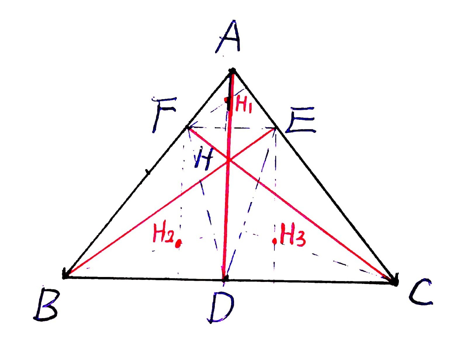 [性质11] 设H为非直角三角形的垂心,且D、E、F分别为H在BC,CA, AB.上的射影,H1,H2,H3分别为△AEF,△BDF,△CDE的垂心,则△DEF≌△H1 H2H3.