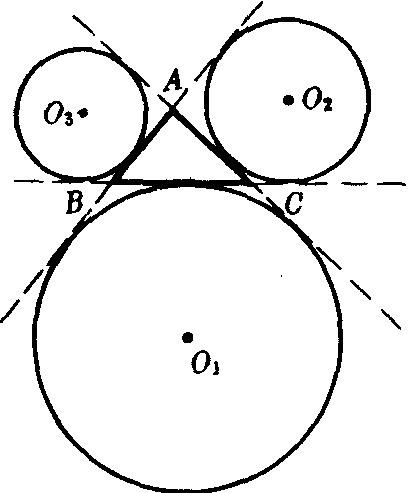 [性质3] 任意一个三角形都有三个旁切圆,三个旁心。旁心一定在三角形外。即⊙O1、⊙O2、⊙O3是△ABC的三个旁切圆, 〇1、〇2、〇3是△ABC的3个旁心,它们都在△ABC的外部。